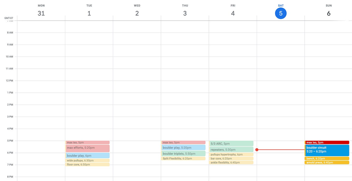 I’ve really enjoyed how boulder triplets on the tension board make me feel. It feels like I’m targeting a significant weakness, riding beginner gains, and making rapid progress. I feel similarly about the strength and conditioning workouts I’m doing.